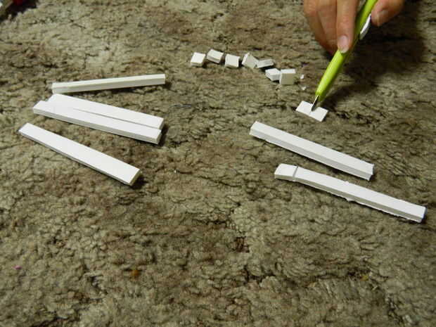 3. recorte todas las espuma espaciador brocas (4 cuadrados y 4 bares para las esquinas y los lados de cada capa de papel)