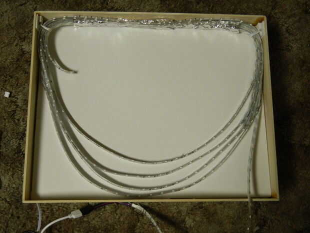 3. organizar sus luces para iluminar todas las zonas que se desea. Puesto que utilizamos LEDs RGB pensando que era cheapo y cool tener varios colores (que es un poco), hemos tenido que lidiar con puntos rojos, verdes y azules por todas partes. Alejado de las luces en la parte posterior de la caja para ayudar a difundir las luces y cubre la parte superior del LED para reducir la concentración del arco iris hasta la parte superior. El paquete fue atado con lazos twisty y colgado a lo largo de los lados de la caja, con ganchos de la pared.