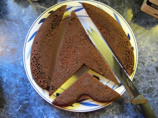 Porque tanto mío debían ser de la misma forma, coloqué los trozos desde el primer corte en la parte superior el segundo pastel como patrón.