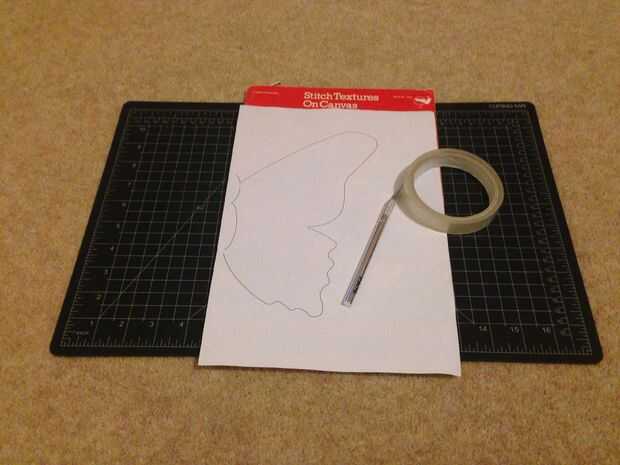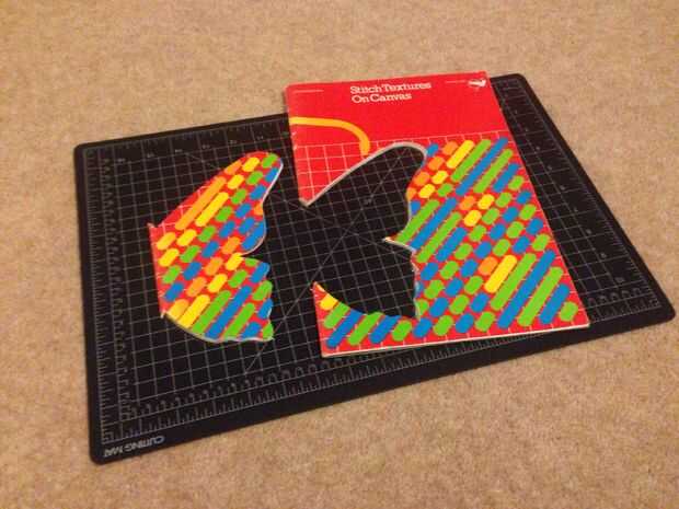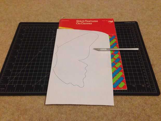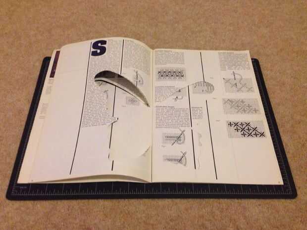 Colocado mi plantilla en el frente del libro, fijo abajo y cortan alrededor. Debido a que yo no podía cortar a través de todo el libro de una sola vez, tuve que hacerlo en etapas, abriendo el libro y remontar la última página de 'cortar'.