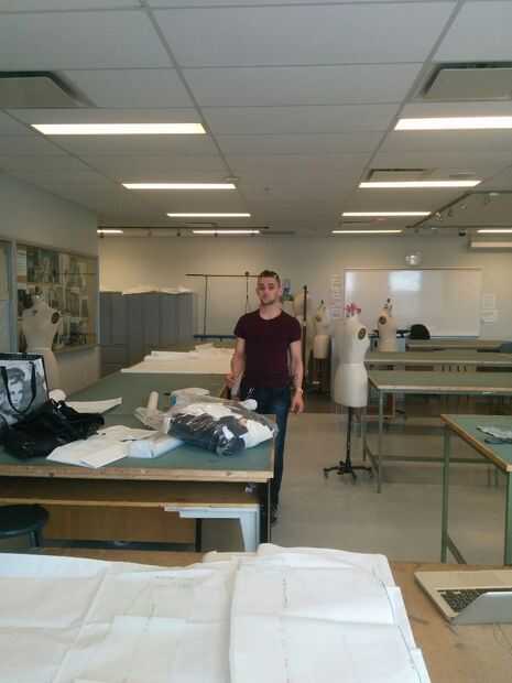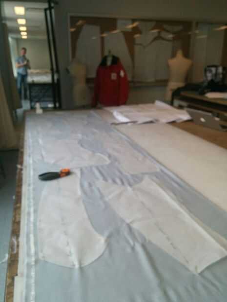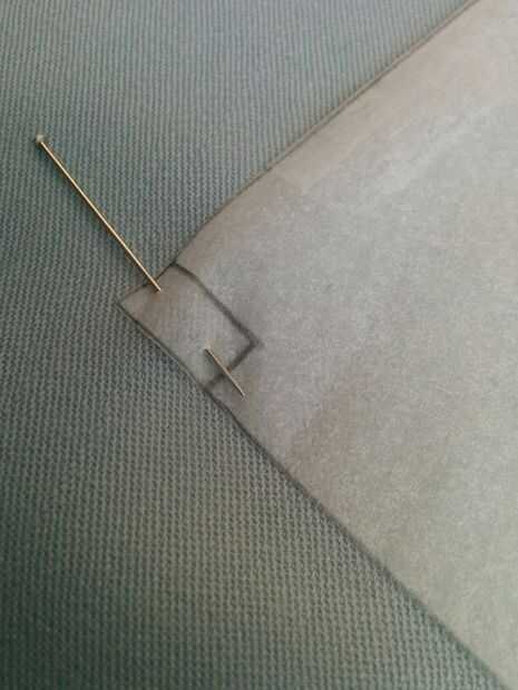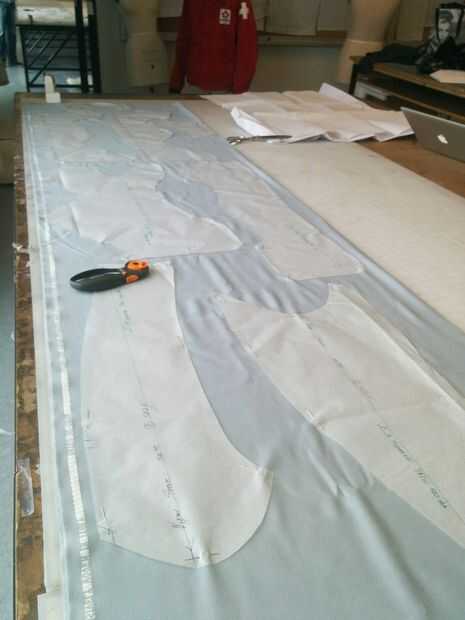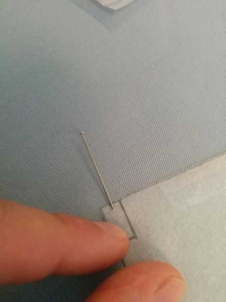 Mi hermano a una distancia segura, una caja de alfileres en la mano, comencé el proceso de fijación de los patrones para las 2 capas de tela.