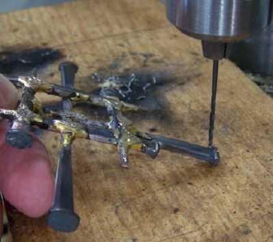 Una vez hice uno de estos para una mujer que lo admiró. En su caso, montó una pieza cara 8 de acabado nogal. Utilicé cuatro broches de alambre como separadores y con mucho cuidado los soldadas a la parte posterior de las uñas. Eso es algo difícil de hacer porque siempre hay la posibilidad de soldar el material fluirá alrededor a la parte delantera de la Cruz donde no se supone que cualquier soldar el material. Trabajó, sin embargo.