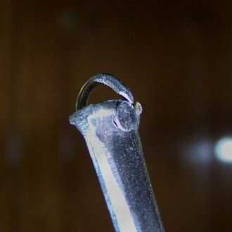 Inserte un brad de alambre 3/4 o 7/8 pulgadas de largo desde la parte posterior. Moler ligeramente a algún borde afilado en el punto del brad. Alrededor de la curva con un alicates de nariz de aguja. Hacer el loop como liso y redondo como sea posible.