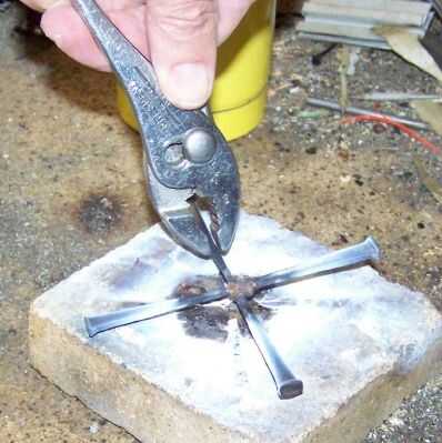 Cuando haya enfriado un poco, tirar la Cruz principal del ladrillo con una pinza. Ten cuidado. El ladrillo y los clavos son todavía lo suficientemente calientes como para causar dolor al contacto. Reservar el conjunto cruzado principal.