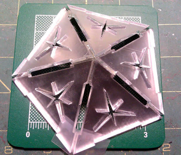 Nota al margen: acrílico generalmente tiene un papel o película protectora plástica. Esta película no debe retirarse hasta que sea absolutamente necesario. No retire la película de las caras hasta el icosaedro fue completamente montado. Instalación de los puntos, pelado suficientemente de las fichas para hacer el pegado, quitar solamente completamente cuando la Asamblea había terminada. (Usted no quiere epoxi las huellas dactilares en su proyecto!)