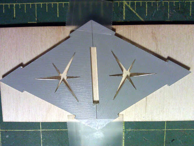 Cada empalme fue primera plana junto butted y grabado en el interior para formar una "bisagra", luego colocar epoxy en las esquinas, forman el ángulo correcto con mi plantilla y había sostenido con pinzas para la ropa mientras que el conjunto de epoxy.