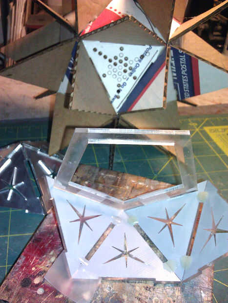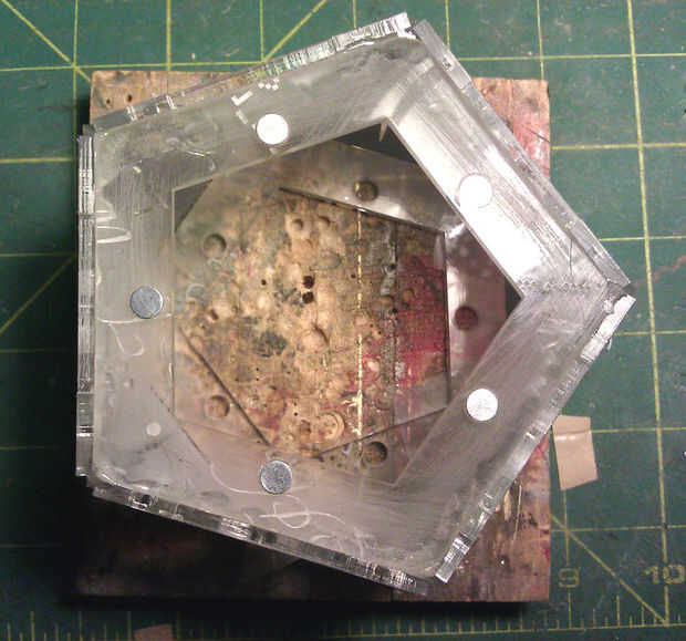 Yo había diseñado dos tamaños de pentágonos para reforzar el interior; los más pequeños dentro de las tapas y el más grande dentro del ring. Maltratados los pentágonos con papel de lija para mejorar la adherencia, luego volver a construido el anillo utilizando uno de los pentágonos como base, utilizando gran cantidad de cinta para celebrar juntos y de epoxy en cada esquina. Esto funcionó mucho mejor, y es razonablemente resistente cuando el pegamento. Cuando los puntos se agregan más adelante, proveerán gran parte de la fuerza.