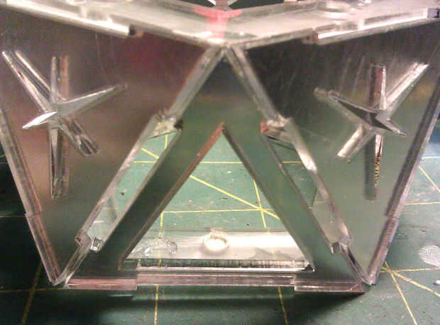 En la foto de las piezas en el paso 1, se dará cuenta de que uno de los triángulos en el ring se hizo abierta para facilitar la instalación de la iluminación. El plan era instalar una toma de luz en un triángulo más pequeño y luego pegar el triángulo más pequeño del triángulo abierto. Dependiendo de cómo se instala iluminación, puede no ser necesario.