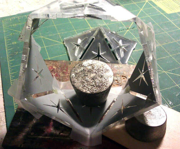 Sabía que necesitaría un refuerzo interno, especialmente cuando se refiere a la tapa removible, pero mi idea inicial era construir el anillo primero, luego añadir dos piezas de refuerzo pentagonal en los lados. Funcionaba hacia fuera muy bien. Incluso el epoxi no pegan muy bien a las partes posterioras de las caras, ya que yo también no pude áspero les para mejorar la adherencia sin destruir el plateado... Así que me dieron mi anillo de 10 caras construido casi completamente, y luego cayó aparte...
