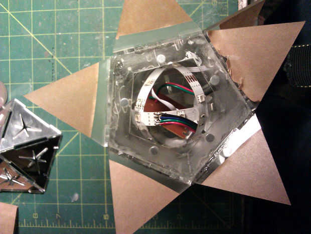 Los puntos alrededor de la abertura será un desafío pequeño. Se pegan a la parte principal, en lugar de la tapa del pentagonal. He instalado temporalmente la tapa para que alineación sería más fácil, pero recuerda sólo poner epoxi en un lado de estos puntos, para evitar el pegado de la tapa para el cuerpo.