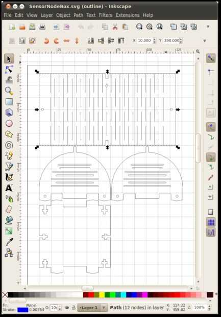 - Usando la ruta de herramienta de edición, perfeccionar las formas, dibujando en las clavijas y ranuras en T para los tornillos. Utilicé una rejilla de 1 m m para el 90% de la obra. Para piezas precisas como las ranuras en T, he seleccionado los nodos que debían ser "off grid" y entraron manualmente las coordenadas.