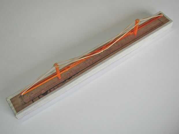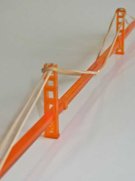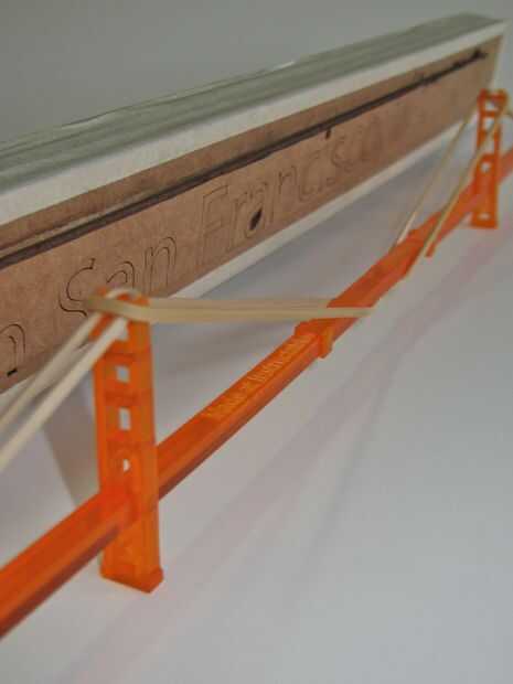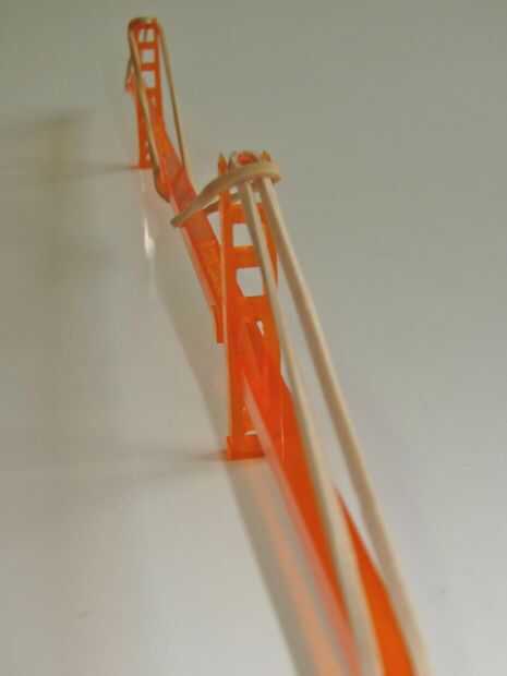 Más modelos de souvenirs del puente Golden Gate no son ciertas a escala; al mismo tiempo acortando drásticamente su longitud y haciendo hincapié en los cables de suspensión vertical, pero descuidar mostrar cuánto el puente en realidad es. Obviamente mi modelo se simplifica demasiado, pero he decidido ir en otra dirección. A unos 30 cm largo el modelo es a escala real 1/6500. Los cables de suspensión principal se simplifican a bandas elásticas para seguir el tema del calendario de Adviento usando solamente la hoja de acrílico, tornillos y tuercas y bandas elásticas. En que escala se vuelve impracticable reproducir los cables verticales. Da otro enfoque, pero aún así, todo el mundo en el área de la bahía de San Francisco inmediatamente lo reconoce como el puente Golden Gate.