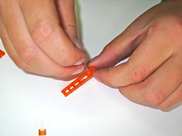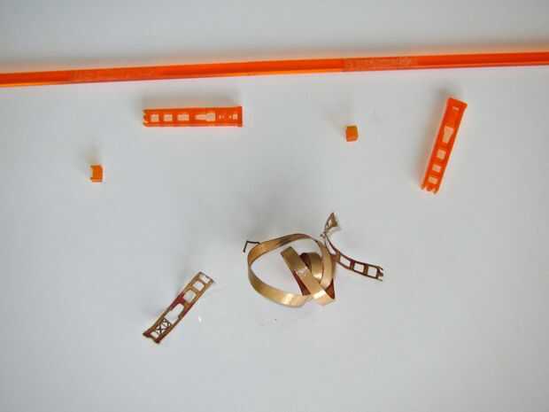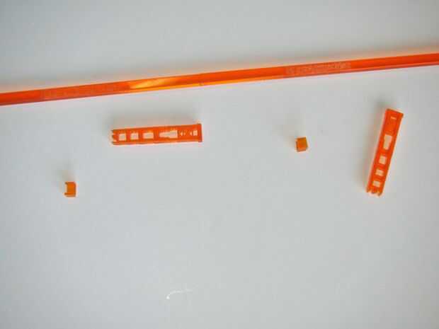 Voltee la caja y darle un golpe para sacar las piezas. Si no todas las piezas vienen hacia fuera de usted puede utilizar un pin para sacar hacia fuera. No te preocupes si no todas las pequeñas piezas en forma de C salen. Esto hace que las matrices de soporte opcionales que puedes ver colgando en el puente a veces y mientras usted ve generalmente dos, he añadido 4, porque fácilmente romperse o perderse).