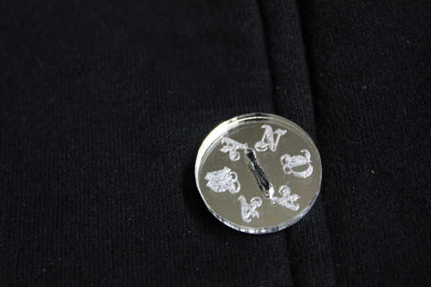Como se puede ver, esta capa carece de dos botones. La capa era bastante barata, y los botones incluso más barato, cosido en hilo de algodón débil, así que decidí arreglar con algún espejo acrílico botones personalizados con mi nombre en ellos.