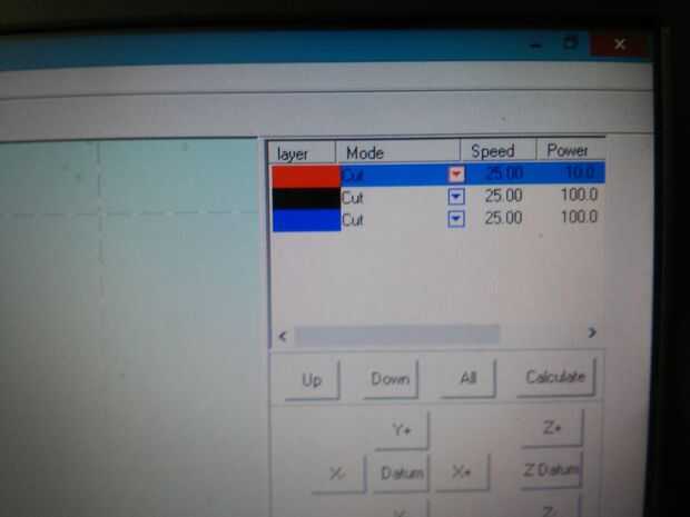 Si usas mi anidación del paso anterior, use el siguiente orden de corte: rojo, negro, azul. De esta forma el láser siempre estará en foco. Las líneas rojas están marcando las líneas, tienen que cortarse en muy ligero (también grabado posible, pero esta tarda más).