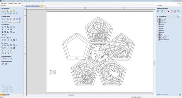 La tarjeta fue 210gsm. Puede tomar un tiempo para cortar todos los detalles, así que quizá quieras probar cortando una cara Pentágono primero para confirmar que la configuración del láser es correcta. Una vez que estés listo para cortar te recomiendo cortar primero las líneas de doblez, a continuación, el detalle. Si usted piensa que necesita una sección siempre puede dar una sola área un segundo paso. Por último corté el Pentágono fuera de lo que será la parte superior, seguido por el contorno.