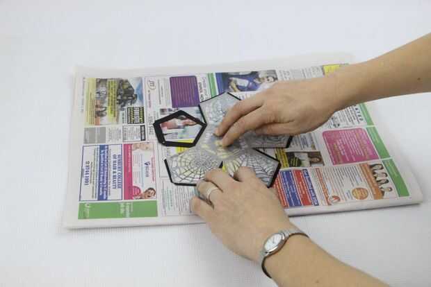 Cuando esté listo, coloque el primer panel de marco en periódico y rociado ligeramente con el adhesivo. (Si utiliza PVA, poner con moderación alrededor de los bordes de marco). Alinee el papel en el marco y presione hacia abajo. Levante el marco del periódico por lo que el periódico no atascarse también a la forma!