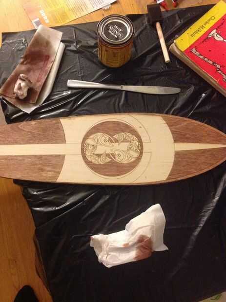 Puede elegir a la Junta de la mancha sin embargo desea, o incluso dejarla sin mancha. Si decides la mancha, frote ligeramente la madera con la mancha y la mancha debe ir al grabado, pero no más allá de ella, que da las líneas limpias agradables que ver en el tablero. Hacer ambos lados de la Junta.