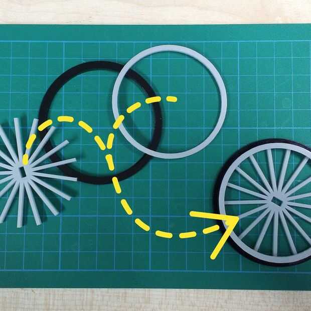 Comenzar fijando las 2 ruedas. Lugar 'gris' de los rayos dentro del neumático 'negro' y tachuela juntos en un par de lugares. Añadir el anillo de empuje 'gris'. y este conjunto juntos. Repita el procedimiento para hacer que las 2 ruedas.