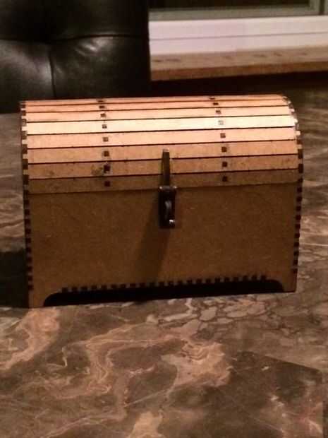 Me gustó la mirada, sensación, tamaño y dimensiones del proyecto original, pero me decepcionó con el mecanismo de bloqueo que me atrajo al proyecto en el primer lugar. La cerradura se ve y funciona muy bien! El tamaño de la cerradura ocupa demasiado espacio en la caja para mi gusto aunque. El proyecto remezclado reforzado las bisagras por asegurar una segunda pieza a la caja y estabilizar el conjunto. El cerrojo es un cierre más sencillo que fue tan eficaz como la cerradura y era más pequeño. Tuve que reducir el dibujo en mi área imprimible para el láser. El pecho con el bloqueo estaba destinado a ser cortado en MDF de 3mm y el pecho con cerrojo fue diseñado para cortar en madera contrachapada de 5mm. No pude hacerte de cualquier madera decente que sea tamaño usé pegamento aerosol para laminar 2 slipsheets de fibra que tengo del trabajo. Cada hoja era aproximadamente 1/16" que me dio una áspera 1/8" pero más cerca a 3mm.
