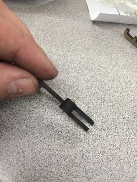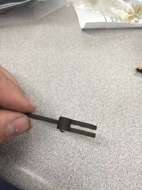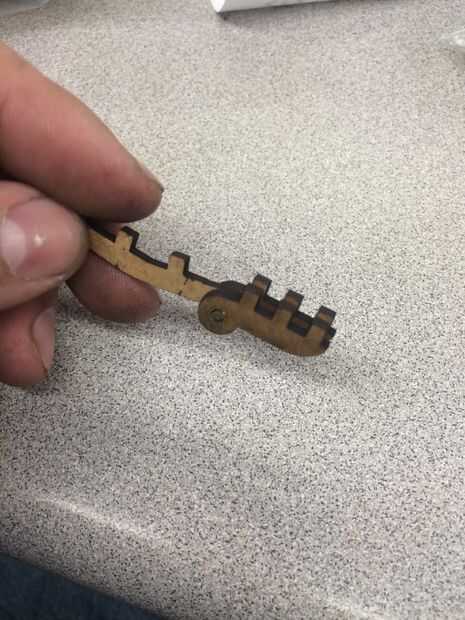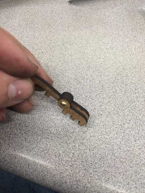 Para el cerrojo se reúnen 3 piezas largas y 2 piezas rectas y 1 de los tapones de círculo pequeño con el agujero. abetos de montan las piezas rectas por fijar el conector entre con un perno de cobre amarillo. A continuación inserte un alfiler en cada una de las piezas largas con el orificio más pequeño. La pieza con el orificio grande se puede pegar en los 3 orificios de la tapa. seguir adelante y las otras 2 piezas largo a cada lado del pegamento con las clavijas que sobresalen. Deslice las piezas rectas 2 y sostenerlos en su lugar apretando las clavijas hacia el centro. Martillo, archivo o cortar cualquier latón sobresale de la articulación. Último pegue la lengüeta en la ranura en la parte delantera de la caja.