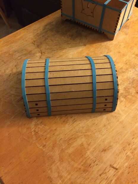 Para montar la parte superior primero separe las 3 piezas de listón diferentes en grupos. un 3 piezas con 3 agujeros en el centro, 3 piezas con 2 agujeros en cada extremo y las piezas restantes sólo hay 1 orificio en cada extremo. Comience pegando las piezas con 3 agujeros en el centro de las costillas de apoyo para la parte superior. Estas son las 2 formas de medio círculo finas, no las 2 formas de medio círculo sólidas. Estos 3 primeros listones será la parte delantera de la caja que el cerrojo encaja y debe estar en la parte inferior del mismo lado. Siguiente pegamento en las piezas que tienen 2 agujeros en cada extremo. Estos sostienen la pieza bisagra que conecta la parte superior hasta la parte inferior. Estos deben ser en el lado opuesto de los listones de la primera. Ahora colocar y pegar los pedazos sólidos de medio círculo a los exteriores de las lamas. Sosténgalos en su lugar con otra banda elástica. Terminar pegando en los listones restantes luego vuelva a su primera banda de goma con 4 más, envolviéndolos en los orificios de los listones y sobre los extremos en el pegamento común.