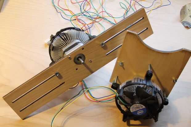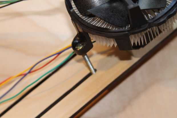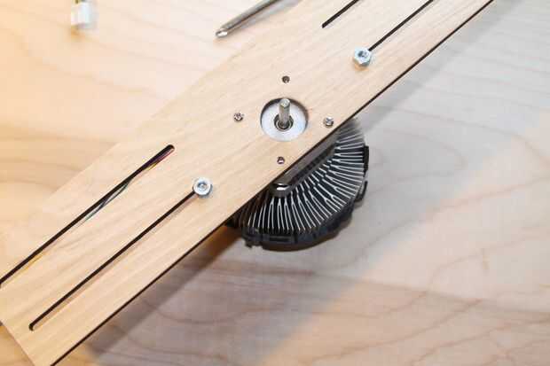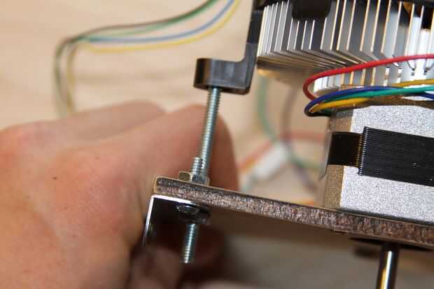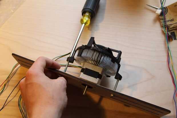 Envíe que el M3 más los pernos a través de los orificios restantes del montaje del disipador de calor plástico (los que no corte) y sus respectivos orificios en la madera. El disipador de calor motor esfera tiene tres agujeros hechos especialmente para él, mientras que los tornillos del disipador de calor motor pluma simplemente pasan por el final de la ranura superior. Asegúrese de que todos los pernos se aprieten uniformemente, para que la superficie plana del motor trasero es totalmente paralelo a y presionar contra la parte plana del disipador de calor. Aunque no mencionado anteriormente, en este punto uno podría optar por usar almohadillas térmicas o pasta térmica, para mejor conducir el calor lejos de los motores, sin embargo es innecesario como un contacto de metal a metal sólido debería ser suficiente.