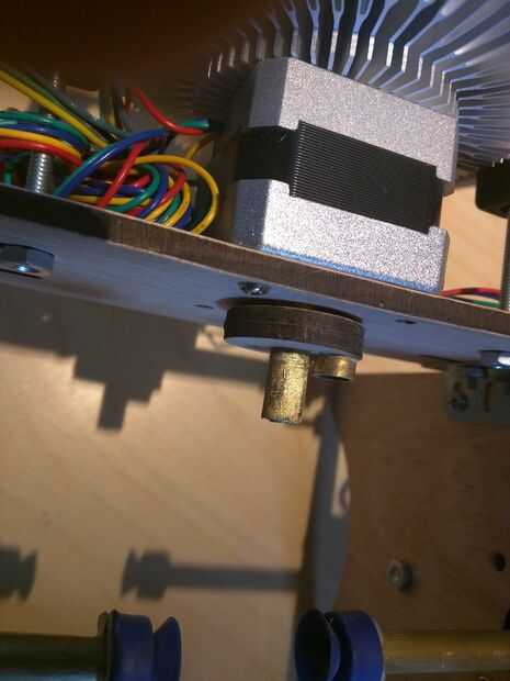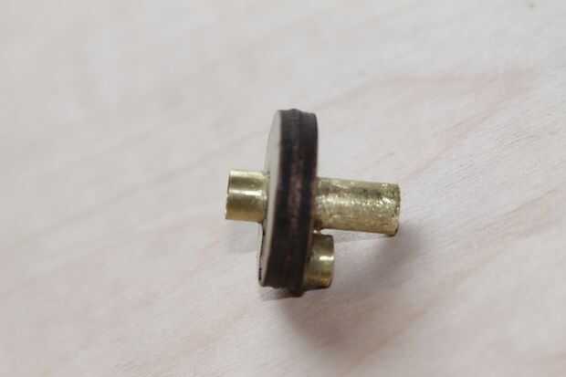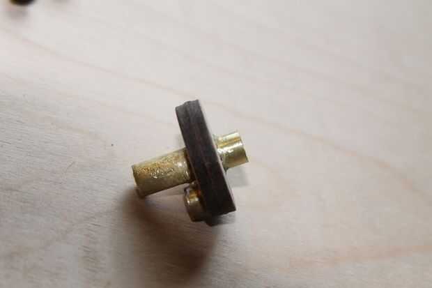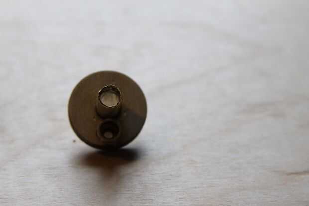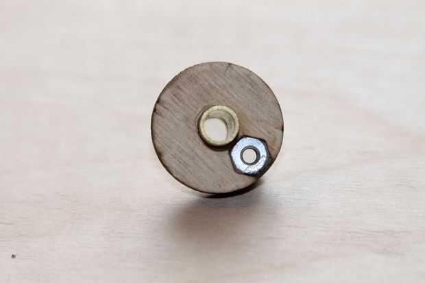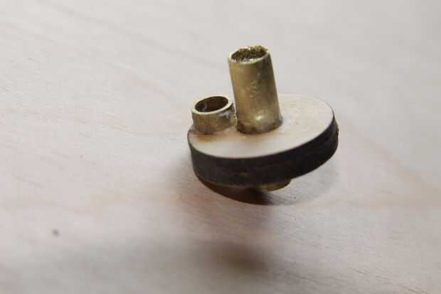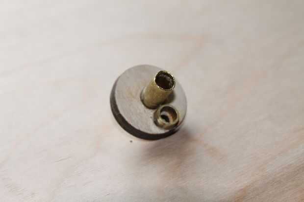 Una vez más, pido disculpas por el hecho de que esta obra ya fue construida antes de tomar fotografías, pero que puedes ver cómo esto se armó. Las dos piezas que fueron cortadas de 1/8 madera contrachapada son colas, con el centro de la abertura hexagonal alineado con el de la abertura circular. Entonces, una de las tuercas #6-32 es superglued en la abertura del hexágono, mientras que el.8 cm larga sección de tubería de latón se pega en la abertura del círculo opuesto. Lo 3 cm de largo del tubo de cobre es enviado a través del agujero central y pegado para que el extremo más largo, que debe ser aproximadamente de 1,5 cm de largo *, está en el mismo lado que sobresale el tubo más corto del.