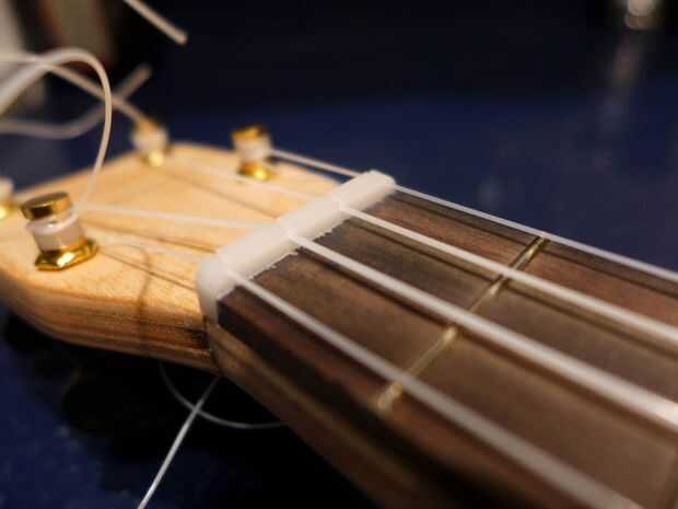 El delrin para la silla de montar y tuerca es más uniforme y es más fácil cortar conlleva. Un área a tener en cuenta es que en la tuerca el láser corte las ranuras para las cuerdas tienden a estar tapado por la viruta del corte, en que la clavija pequeña de residuos de la ranura de corte está fusionada al lado de la tuerca que se desea mantener. Como resultado usted tendrá que limpiar las ranuras de la cadena y puede necesitar un bisturí o similar herramienta afilada para limpiar las ranuras. Mientras que la silla de montar de delrin se sentará en el puente sin apretar, se llevó a cabo en lugar por la presión de las cuerdas, la tuerca se pegar a la parte superior del cuello. Delrin es muy resbaladizo y colas no se peguen, por lo que una vez que las ranuras de la cadena están habilitadas para su satisfacción tendrá que decidir qué lado va pegado al tablero del traste y cuello y áspero estas caras para arriba con papel de lija de grano 220 para ayudar a la cola del gancho agarrador en el delrin.