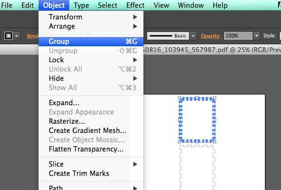 Luego, cada una de las partes individuales de la caja debe estar agrupada por lo que puede ser movidos más fácilmente. Utilice la herramienta Selección, haga clic en y arrastre la selección cuidadosamente de la caja alrededor de una parte de la caja. (Imagen 2, arriba). Una vez que se destaca la parte que desea agrupar, buscar grupo en el menú objeto.