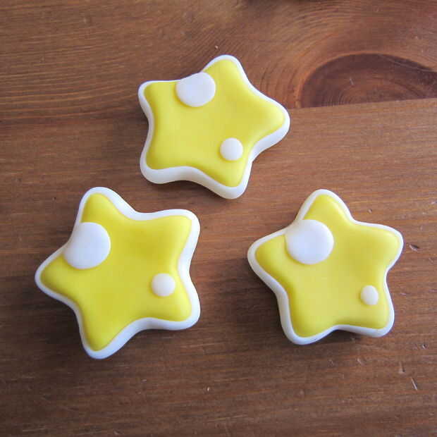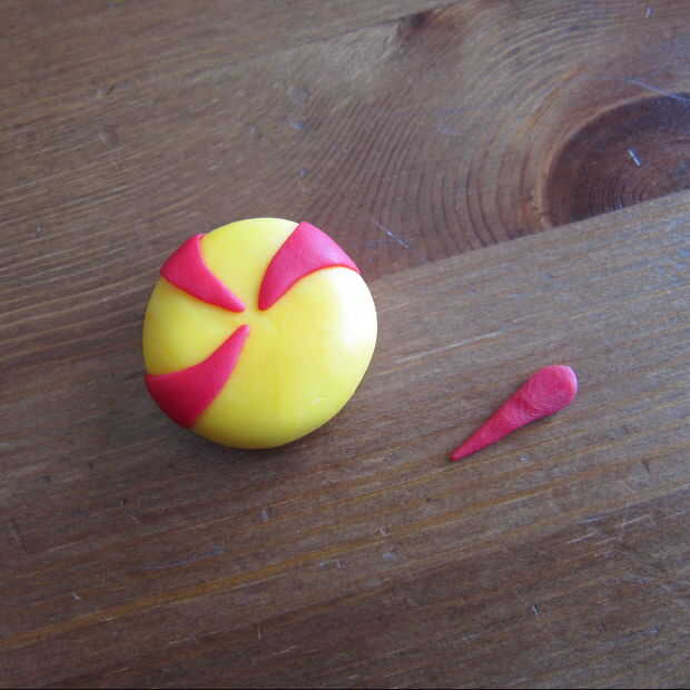 Candy - hacemos una bola con amarillo fondant y presione hacia abajo para que lados planos. Hacer triángulos rojos largo y cuatro de ellos cumplir con los puntos de reunión en el centro.