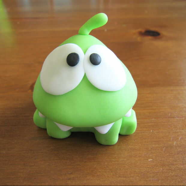 Om Nom - decidí después de Om Nom era completa para entrar en este pastel y empezar a tomar fotos así que no tengo buenas fotos del proceso para hacerlo. Es dos piezas separadas. Empecé con una básica media esfera y luego hizo la parte superior de su cabeza un poco más acentuado y sangría de la parte inferior para que la cabeza se siente bien en la base o la parte inferior de su cuerpo. Hacer un pequeño poco forma de serpiente, redondeada en el extremo de la parte superior de su cabeza. Utilice un poco de agua para pegar en. Para los ojos simplemente presiona algunos (fondant) blanco pero se podría rodar con un rodillo si quieres. Obtener la forma que desee y pega otra vez las piezas con un poco de agua. Hacer dos pequeños puntos negro hacer los ojos. Para hacer el fondo de Om Nom comience con otra media esfera. Usando un cuchillo de mesa corte un cuadrado de la parte delantera para hacer sus patas delanteras. Deberás darles forma y suavizar el fondant donde se corta. Hacer dos cubos y pégalos en los lados para hacer sus patas traseras. Hacer cuatro triángulos ancho redondeados y ponerlos debajo de la pieza superior para hacer los dientes.