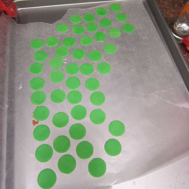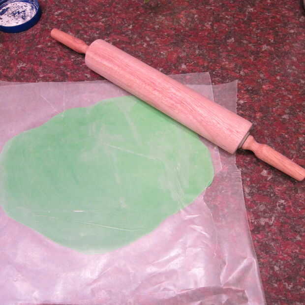 Utilice sus dedos para alisar el fondant asegurándose de que no hay ningunas grietas visibles. Use un poquito de agua para obtener piezas para pegar uno al otro. Si usted necesita muy piezas delgadas estirar fondant entre pedazos de papel encerado cubriendo el fondant ligeramente con maizena para que no se pegue. Cuando corte los círculos verdes dejé hacia fuera por un tiempo por lo que fueron rigidez y facilitan el trabajo. Una vez que se sientan en la cubierta un rato Haz suaves otra vez así que no te preocupes por tener pedazos crujientes de tu tarta!
