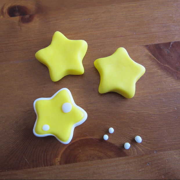 Estrellas - si tienes un cortador de galletas estrella que es el tamaño correcto, sería muy bueno para esto. Les forma con mis dedos desde que no tengo un cortador de galletas y me redondea los puntos. Hacer un blanco fino pequeño agitar y presionar plana. Las estrellas del borde con el blanco para darles detalles y agregar puntos blancos.