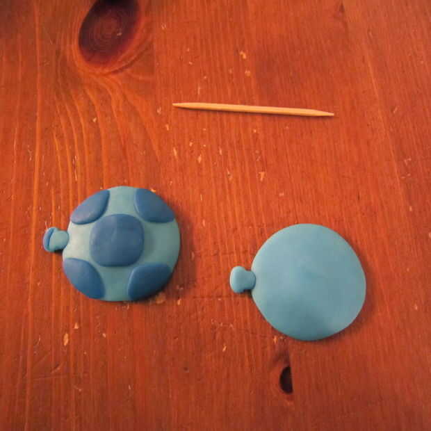 Globos - usando fondant azul claro hacen un círculo que es un poco redondeado y no completamente plana. Añadir un pequeño triángulo a uno de los lados de la boquilla de aire. Usando fondant azul oscuro hacer cuadrados redondeados y agregue al centro. Corte más redondeados cuadrados por la mitad y poner cuatro a cada lado de cada globo.