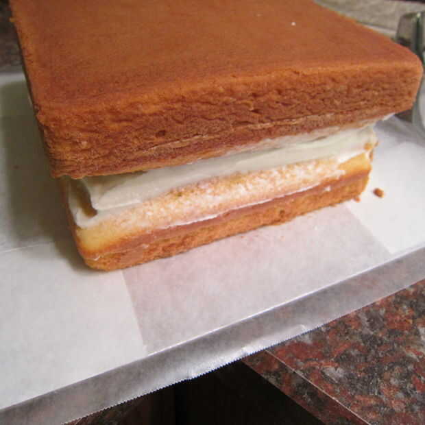 Coloque el pastel inferior sobre una base de torta de algún tipo. Mina era un cuadrado de cartón reflexivo. Corte tiras delgadas de papel encerado para poner debajo de los bordes de la parte inferior de la torta que no Unte glaseado en toda la base. Extiende una capa generosa de crema de mantequilla glaseado en la parte superior. Coloque el segundo pastel boca abajo en la torta inferior.