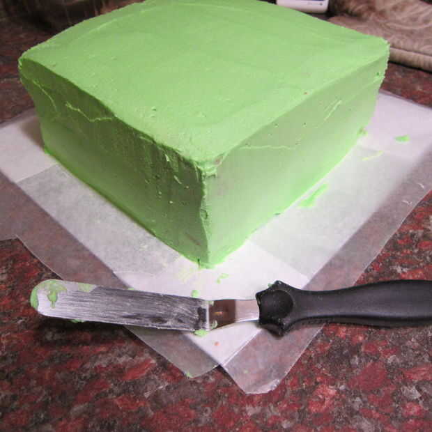 El glaseado restante de la mezcla con comidas coloring(s) y colóquelos en bolsas de tuberías si es necesario. Extensión color principal forma pareja y uniforme en todos los lados de la torta con un cuchillo que se separa.