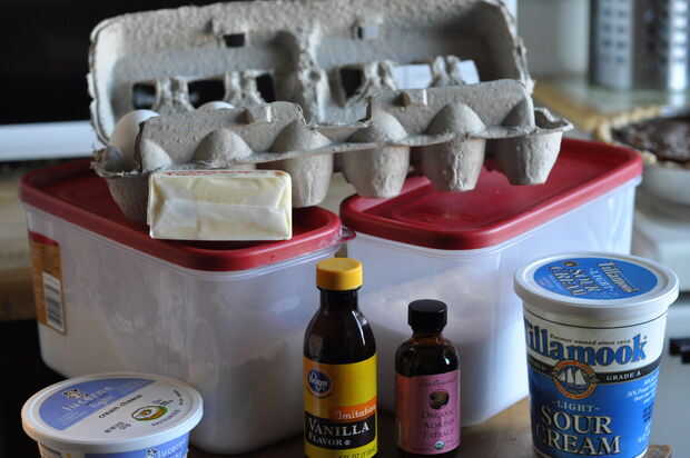1. crema la mantequilla, el azúcar y el queso crema en un tazón grande. Añadir la crema agria, huevos y extracto. Mezclar bien.