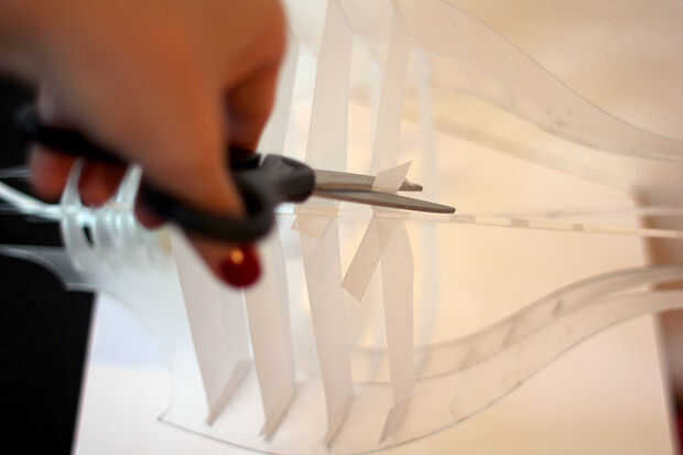 Va alrededor de la circunferencia de la fila de una pantalla a la vez, hilo velo a través de las ranuras. Pegue el papel vitela a la pieza adyacente. Aplique el pegamento con moderación, espera unos 30 segundos para se seque. Puesto que los extremos ayudan a sostener las piezas en lugar de esperar a recortarlo hasta que haya una fila entera. En la última conexión de una fila, mantenga la vitela tensa mientras el pegamento seca.