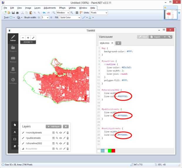 • Cambiar los colores de algunos de los archivos para que sea más fácil de tratar con la cortadora láser. En este ejemplo estoy haciendo todas el calles sólido rojo (#FF0000) y el shore line color verde (#00FF00)
