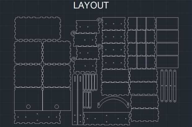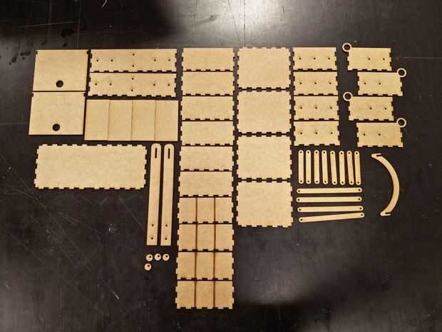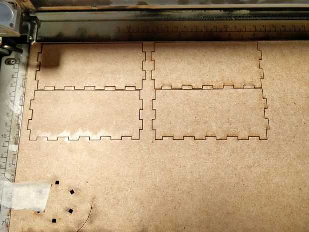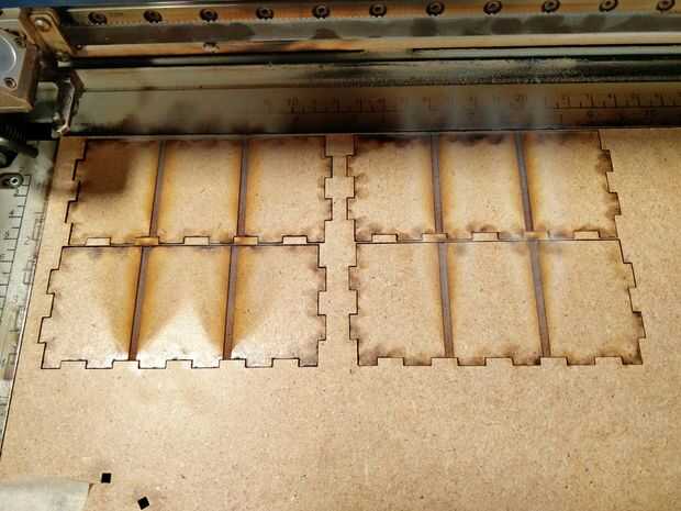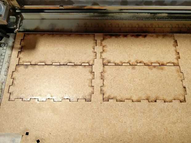 Para este proyecto utilicé un cortador láser en mi FabLab local. El cortador del laser tiene un área de trabajo de 600 * 450 mm. y pueden cortar hasta 6 mm. de materiales blandos (madera contrachapada, MDF, acrílico, etc.). Yo pude meter casi todo el diseño en una hoja. Pero algunas partes se tuvieron que ir en otra hoja. En este lasercutter, la parte que se corta logra flashmarks en la parte inferior del corte, porque el material descanse sobre una malla de nido de abeja de metal. Así que cuando el láser quema a través y golpea el metal chispa y dejan una marca en la madera, aunque pueden eliminarse con un paño de microfibra húmedo. Yo quería que la flashmarks estar en el interior de la caja, algunas piezas tenían que desea duplicar. Porque tenía que hacerlo, dos de las placas en las dos cajas superior tuvieron que ser cortado, dio la vuelta y luego grabado por la ranura donde van los dividerers en.