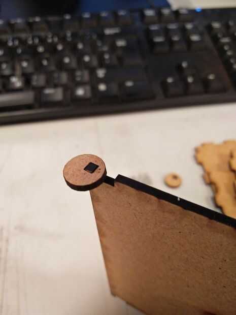 La tapa se pega mediante la adición de los dos círculos pequeños en las dos muescas, lo más importante es asegurarse de que el borde que la tapa gira alrededor se fijan en el centro del círculo. Yo deje la tapa secar por tener que sentarse sobre un borde, no hacer hincapié en la articulación.