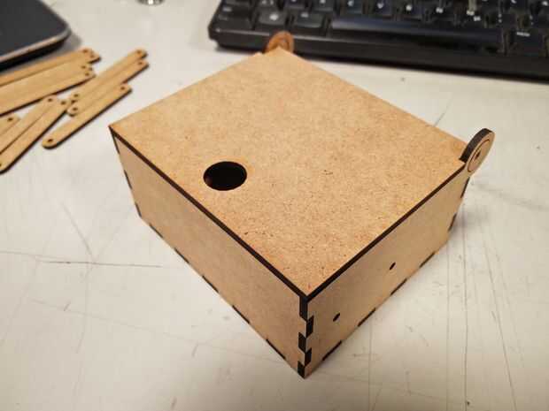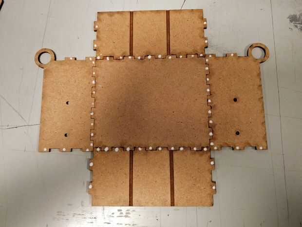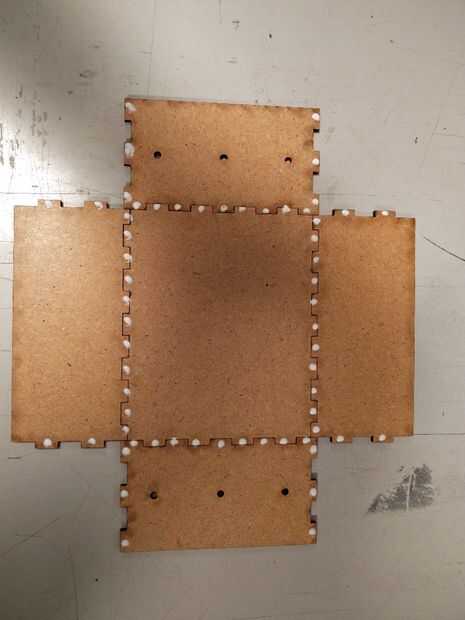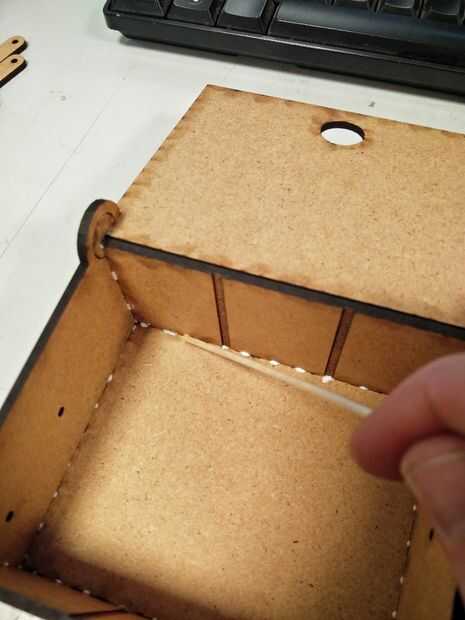 El segundo paso en el montaje de la caja, es para unir las cajas más pequeñas individuales, que conforman la caja grande. Yo uso pegamento PVA de fraguado rápido, funciona bien con la madera y puede fácilmente limpiarse con un paño húmedo antes de que el pegamento se seca. Yo Monte las cajas poniendo las diferentes partes por lo que pueden girar vertical y cumplir con las esquinas. Cada articulación tiene un punto de pegamento. Para hacer la caja superior, la tapa debe insertarse en la bisagra, antes de acoplamiento el cuadro, debido a bloqueos de la tapa y la caja. Cuando el montaje de la cola se exprime de las juntas, para quitar yo normalmente solo limpia con una madera del palillo se corta en un ángulo. También puede utilizarse un hisopo de algodón.