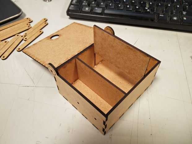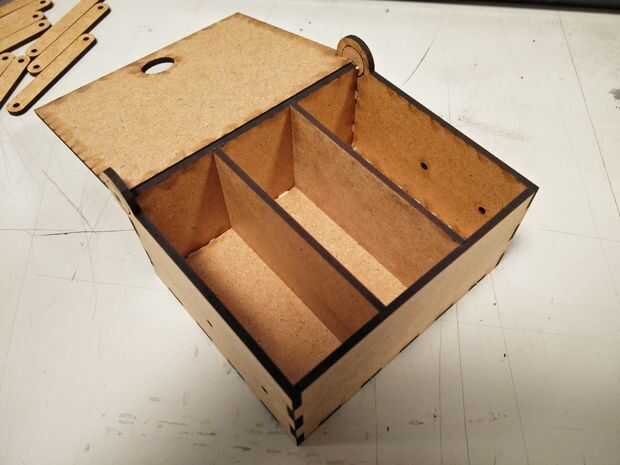 En las dos principales cajas, he grabado una larga hendidura en la madera, mide la profundidad para ser de 0,5 mm y dibujado algunos divisores que pueden deslizarse en el hueco. La profundidad de la hendidura puede variar dependiendo el cortador del laser y el material, por lo que recomiendo que la caja se corta primero, medir la profundidad de la hendidura y cortar unos separadores que se ajustan. He decidido utilizar los divisores en mi caja.