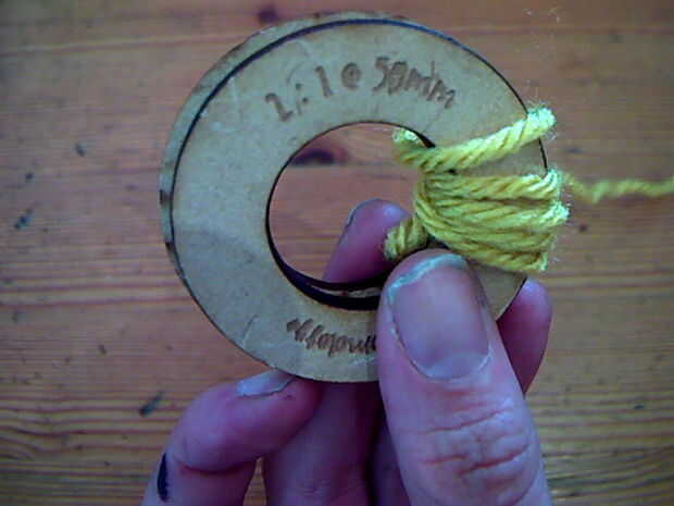 Esto puede ser un poco complicado y toma algo de paciencia. Atar el extremo del hilo alrededor de la máquina en un nudo y entonces alrededor del viento. Debe ser capaz de encajar la bola de hilo a través del centro de la fábrica, así que si tienes una enorme bola de hilo, sólo envuélvalo en bolas más pequeñas primero.