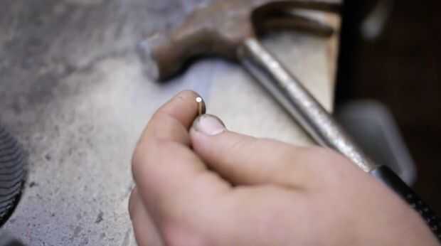 El proceso: Primero lijar el extremo de una plaza de pin tenía una superficie plana para trabajar con. Luego había herida en un lugar y comenzó a tocar muy suavemente el perno. Moví la cara del martillo alrededor de modo que el metal es empujado lentamente. Un martillo granallado haría este trabajo fácil porque la cara redonda guarda el martillo de rotación. Simplemente tocar alrededor del borde del perno con un martillo de granallado.