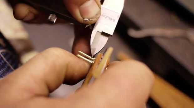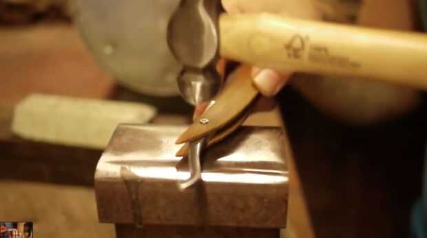 Con las clavijas de latón a través, que desea hacer una marca en el lado opuesto que es un poco menor que el ancho del perno. Rascó una marca con las púas de mi Verniers. Si tienes lavadora, póngaselos antes de hacer esta marca. Este corte aquí y colóquela con el perno que solo ha martillado en su yunque. Comience a golpear hacia arriba. Una vez que ha proliferado esto un poco, alternar entre lados para hacer ambos lados un círculo aplanado, incluso. Usted puede sentir la balanza Tire firmemente en la cuña - esto es también un indicador o cuándo parar. Pegado de la cuña no es necesario pero lo hice.