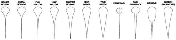 Perfiles de maquinillas de afeitar: La segunda imagen muestra las formas de varias rutinas aplicadas a diferentes maquinillas de afeitar. Si bien todos parecen diferentes, tienen algo en común - la relación de la anchura de la columna a la hoja. Una regla básica es que la proporción de hoja a la columna es 4:1. Sin embargo, puede, ser un poco menos - decir 3.7:1. Esto ayudará de muchas maneras, la primera es que evita que la hoja de entrar en el camino al afeitarse, permitiendo que toda la presión a aplicar en el lugar correcto. Otra razón común es que esto ayuda a eliminar el pelo y la crema de afeitar lejos de la cara. La tercera es que esto le impedirá pulido un borde que es demasiado delgado y tener el borde desmoronando lejos en tus manos no es algo que usted quiere. Hay muchos otros pero estos son los conceptos básicos.