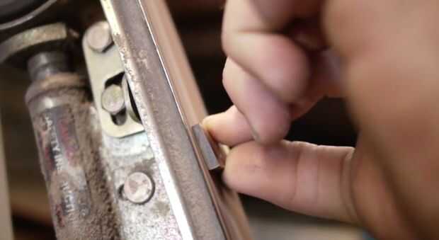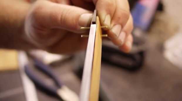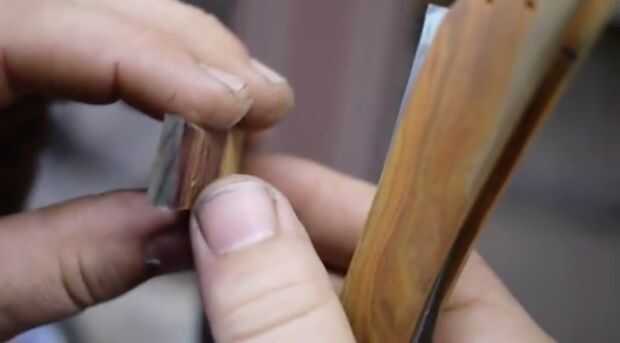 En el video se ver cómo cortar la cuña de mi maquinilla de afeitar a la forma. Es importante que esto se corte o lijado simétricamente para proporcionar presión igual de cada una de sus escalas. La cuña es cónica por lo que la parte superior es ligeramente más pequeña que el ancho de la articulación. Esto ayuda a abrir las escalas para que su afeitadora quede en la parte superior de la báscula cuando está cerrado. Se puede ver me lijado-tratar-resanding hasta la cuña sujeta la cuchilla a la altura adecuada. Stu señaló que no desea la hoja cerca de la parte inferior de las escalas, porque alguien puede cortarse al manejarlo o la hoja se puede dañar por atropellos en algo.
