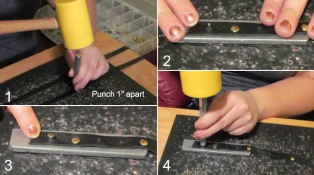 - Usando el martillo de cuero ⅛-inch punch y goma, perfore agujeros en las tiras de cuero de 1 pulgada de distancia.